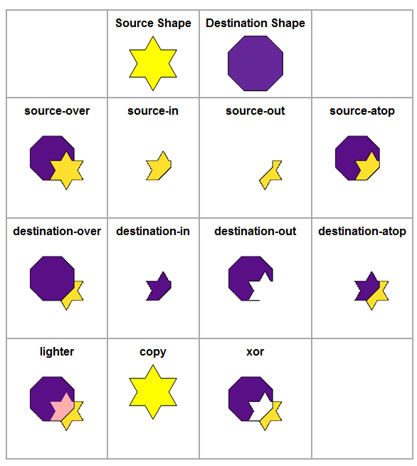 The first shape drawn on the canvas to which additional shapes are added is called the destination shape. The shape drawn on the canvas afterwards to create the composite image is called the source shape. The value of the globalCompositeOperation attribute must be set to one of the following: