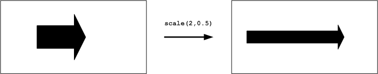 The scale factors are in multiples. For example, scale(2.0, 0.5) would double the horizontal size of an object drawn on the canvas and half its vertical size, as shown below: