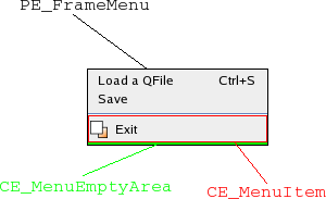 Menus in Qt are implemented in QMenu. The QMenu keeps a list of action, which it draws as menu items. When QMenu receives paint events ,it calculates the size of each menu item and draws them individually with CE_MenuItem. (Menu items do not have a separate element for their label (contents), so all drawing is done in CE_MenuItem. The menu also draws the frame of the menu with PE_FrameMenu. It also draws CE_MenuScroller if the style supports scrolling. CE_MenuTearOff is drawn if the menu is to large for its bounding rectangle.
